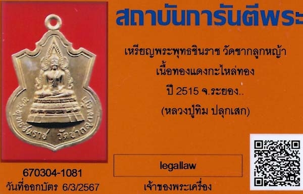พระพุทธชินราช หลวงปู่ทิม อิสริโก วัดละหารไร่ปลุกเสก+บัตรรับรองพระแท้*240 |